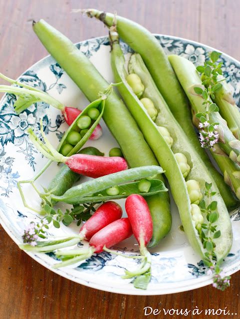 Il y a un mois maintenant, nous avons participé à nos deuxièmes "Vignes Toquées", balade gourmande en six étapes dans les vignes du côté de Vauvert (Gard). Organisée par le syndicat des Costières de Nîmes, cette randonnée de 7 kilomètres à travers le vignoble proposait de déguster une trentaine de vins autour d'un menu gastronomique imaginé par le chef étoilé Bruno d'Angelis (La Vieille Fontaine à Avignon). Plus de 1400 randonneurs ont participé à cette cinquième édition. A leur arrivée, les participants reçoivent un verre de dégustation, des couverts ainsi qu'un chapeau de paille pour pouvoir arpenter les vignes. A chaque étape les vignerons sont là pour faire déguster des vins en accord avec les plats proposés (ils sont une trentaine). L'ambiance est joyeuse et l'organisation bien rodée. Nous notons au fur et à mesure sur un petit carnet nos coups de cœur, et moi comme d'habitude, j'imagine les recettes que je pourrai refaire à la maison. Tout le repas concocté par le chef était délicieux. C'est une prouesse technique de servir autant de monde sur assiette, sans trop d'attente... J'ai beaucoup aimé le plat de poisson (entrée chaude) aux saveurs méditerranéennes (artichaut, encornets et citrons confits) que je referai certainement un de ces jours, mais c'est la mise en bouche que je vous propose aujourd'hui. Très facile à faire, elle utilise au mieux les beaux légumes de saison. Avec peu d'ingrédients (qui peuvent varier en fonction du marché), vous avez une entrée qui en jette avec un joli visuel et tout un jeu de textures et de saveurs... J'ai rajouté ma petite touche personnelle en rajoutant quelques fleurs de thym et de ciboulette (mais vous pouvez vous en passer). Il est plus facile de réaliser 6 tartines que 1400, j'ai pu m'appliquer un peu...
