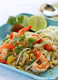 Et pour finir, quelques infos sur la recette. Les nouilles de riz se trouvent dans la plupart des épiceries asiatiques. Il ne faut pas les cuire mais seulement les ramollir à l'eau bouillante pour qu'elles restent fermes. Elles finiront leur cuisson dans le wok avec tous les autres ingrédients. Pour les crevettes, il est quelquefois difficile de trouver des vivantes: J'achète les miennes surgelées (importées de Thaïlande ou de Madagascar). Les pousses de soja se trouvent en GMS, vérifiez cependant leur fraicheur, elles doivent être bien croquantes...